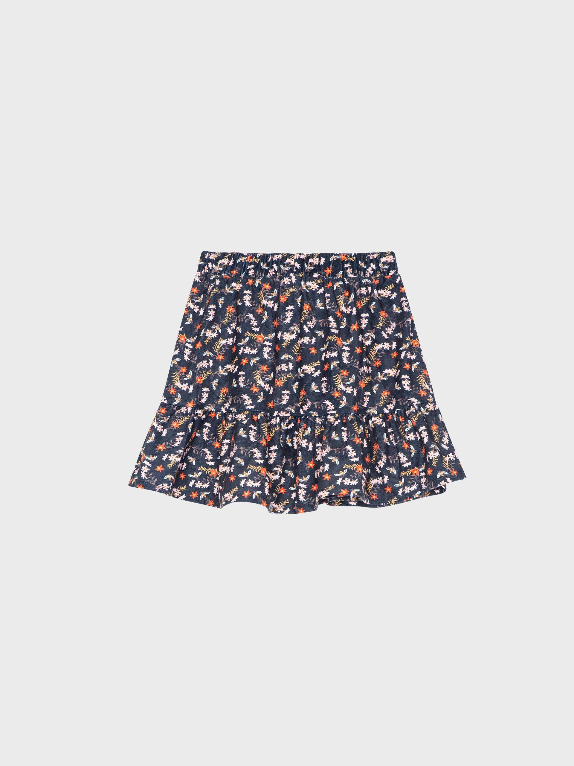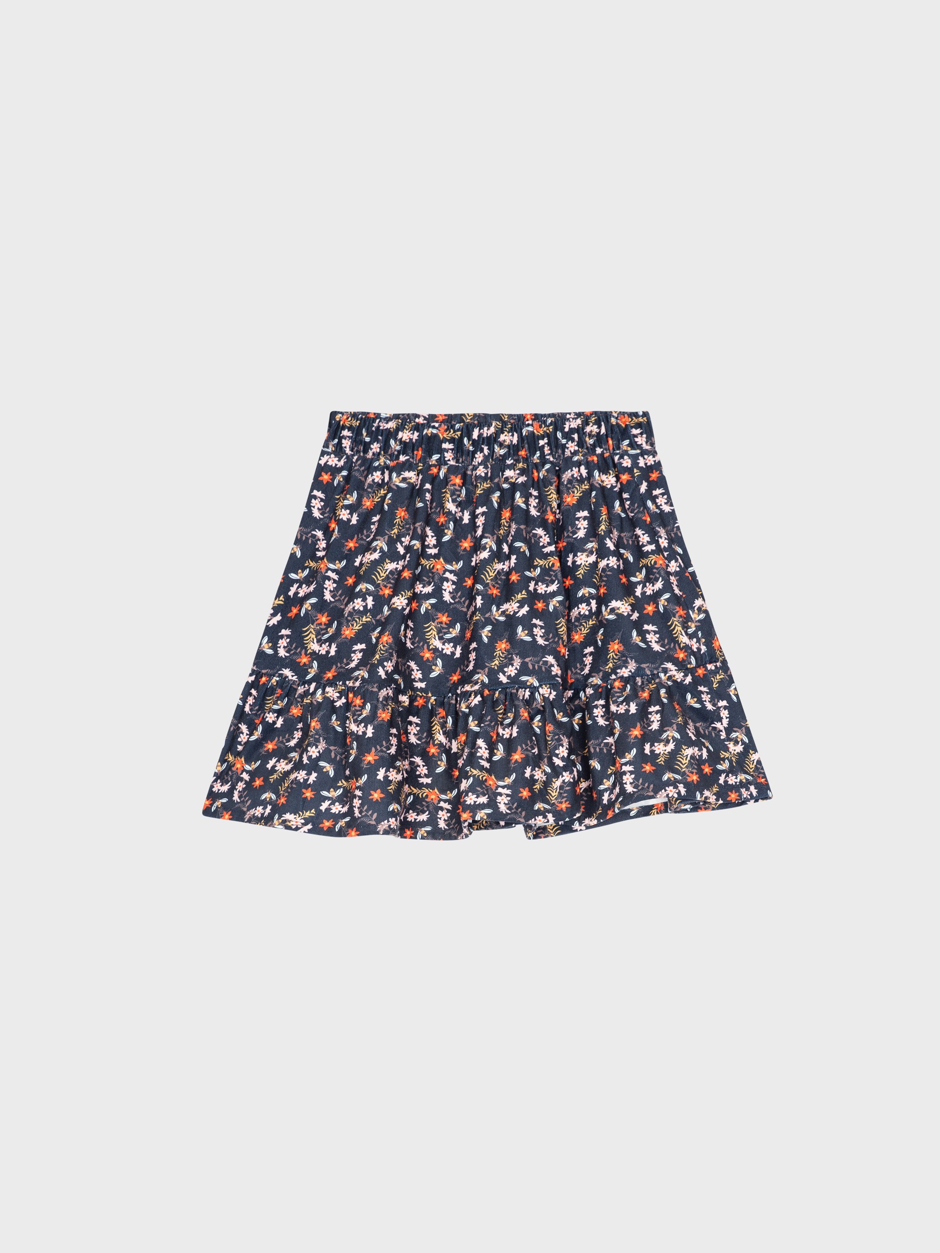 Jupe marine avec des fleurs oranges et beiges et des abeilles.