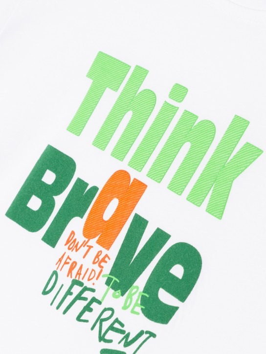 Écriture en vert et orange « THINK BRAVE, DON’T BE AFRAID TO BE DIFFERENT ».